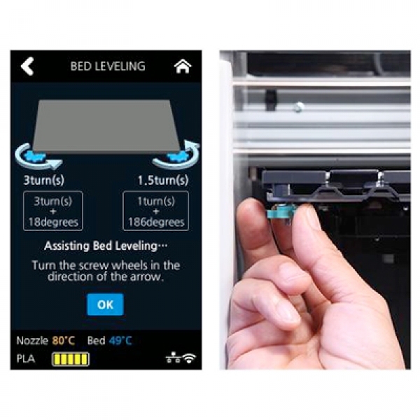Kaliteli baskılar alınmasındaki belki de en önemli etken baskı tablasının tek bir düzlemde kalibre edilmesidir. Evinizin eğimli bir temele inşa edilmesini istemezdiniz değil mi? Aynı durum 3 boyutlu baskı için de geçerlidir. Kalibrasyon işlemi, tablanın altında bulunan vidalar aracılığı ile tablanın yükseltilmesi veya alçaltılması işlemidir. 3Dwox akıllı sensör özelliği sayesinde size doğru açıyı yakalayana kadar rehberlik eder. Tek yapmanız gereken ekranda yazan yönde vidaları çevirme işlemidir.